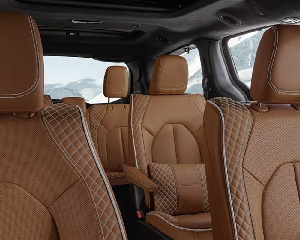 The Pacifica PHEV enhances family outings by seating up to seven passengers and having third-row Stow 'n Go seating. Enjoy natural light and fresh air with the Dual-Pane Panoramic Sunroof. The interior features heated front-row seats and a heated steering wheel for added comfort, while the Pinnacle model offers quilted Nappa leather seats and premium trims.